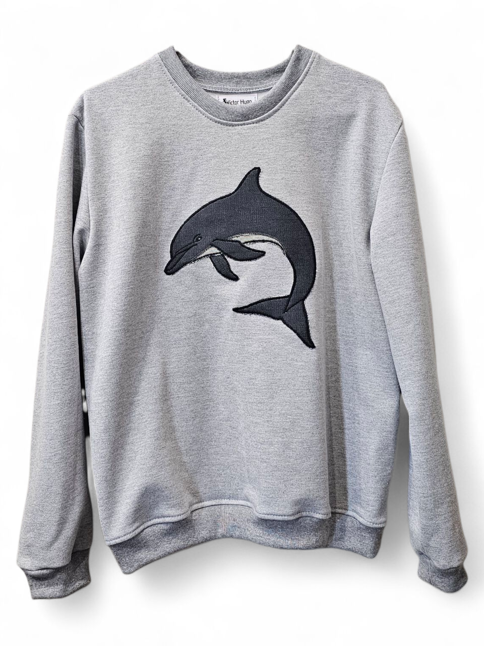 Materiales Utilizados: Diseño en técnica de tela forrada, empleando mezclilla reciclada (upcycled) para el delfín. Polerón de Cuello Polo para un acabado limpio y elegante.