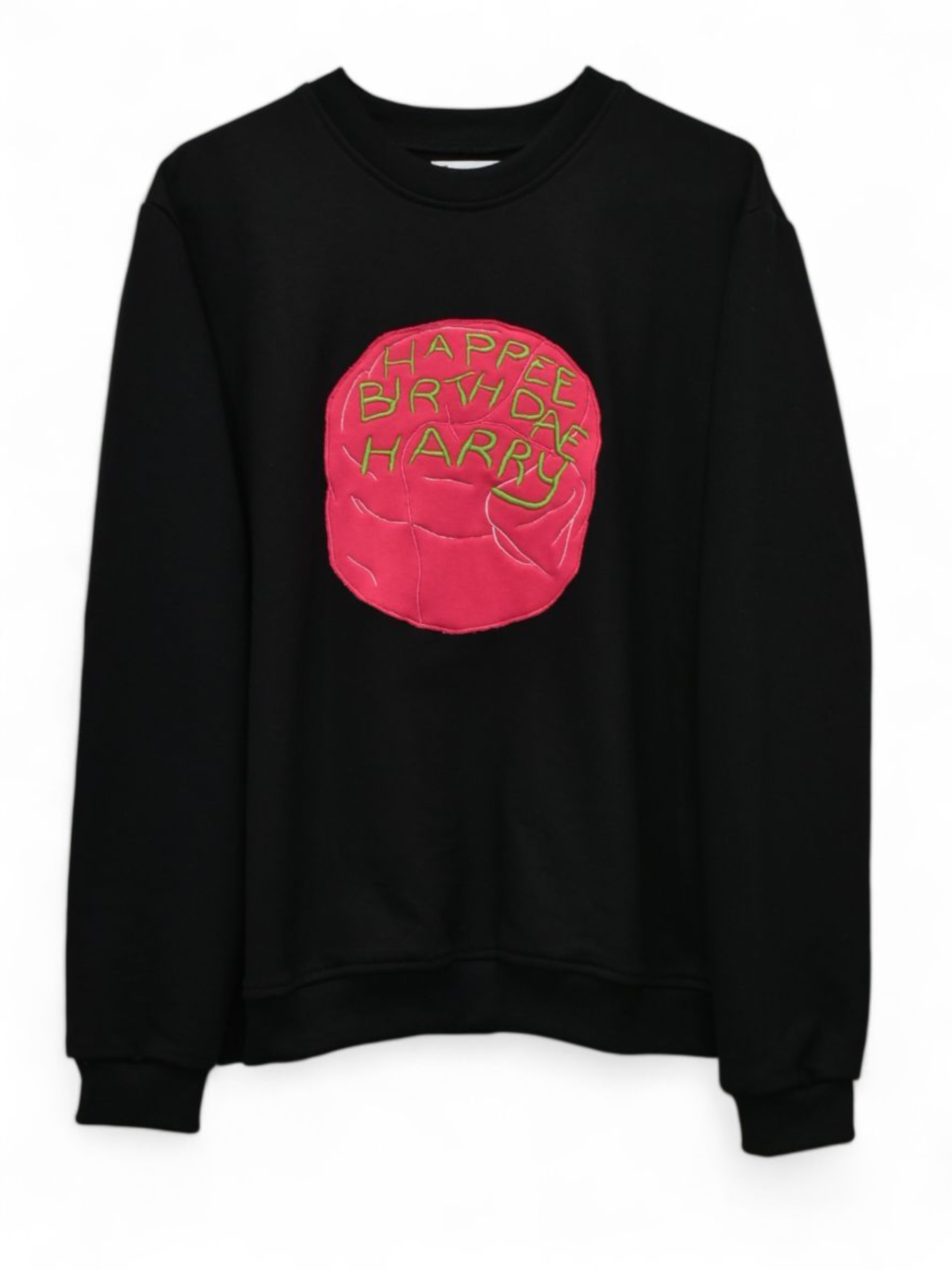 Materiales Utilizados: Franela de color negro. Diseño en técnica de tela bordada para recrear la torta y el texto (con sus imperfecciones). Polerón de Cuello Redondo.