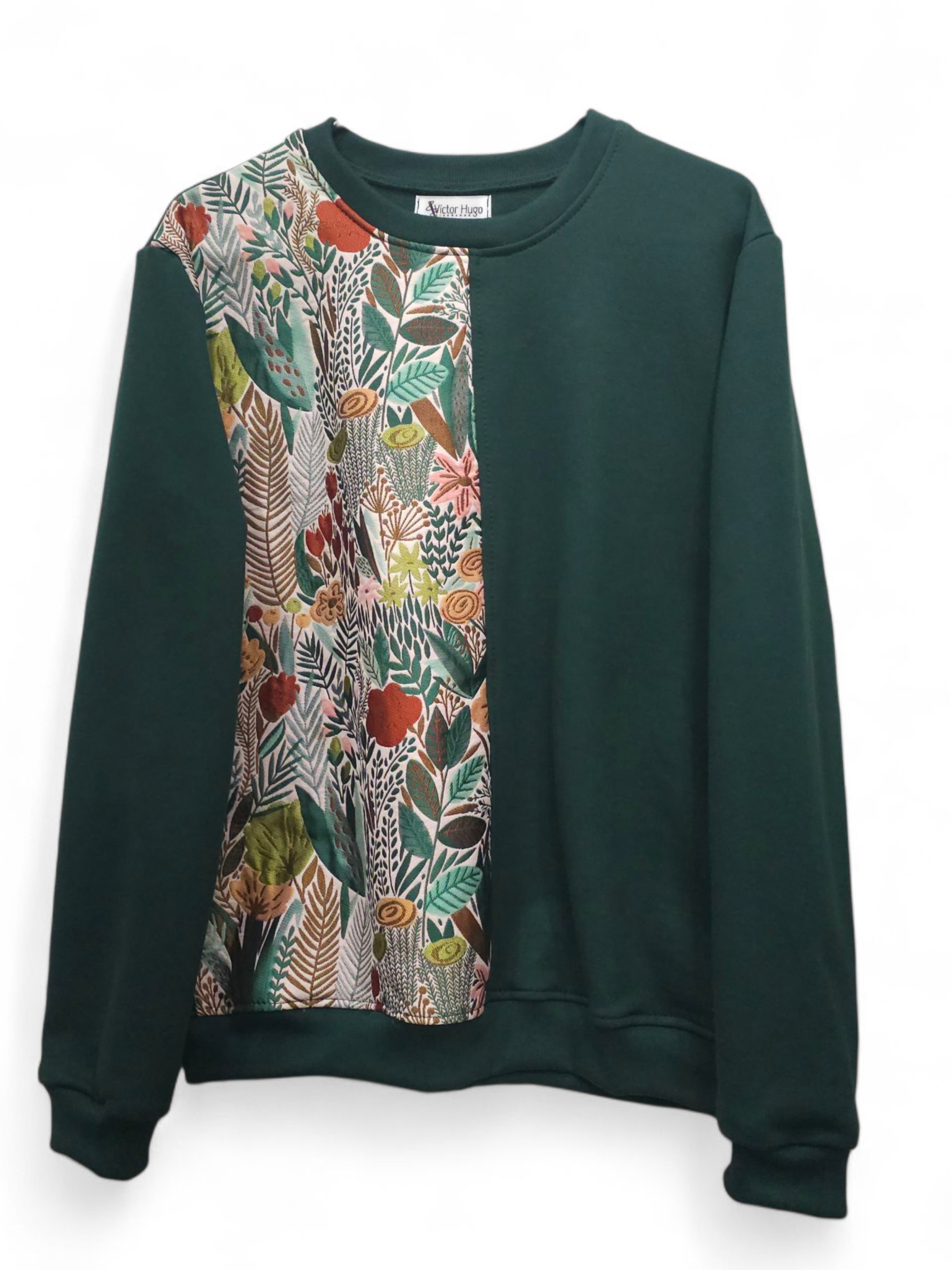 Este polerón representa la esencia de dar una nueva vida a los textiles, reutilizando una tela pensada para otro vestuario con un toque chic y respetuoso. Su diseño presenta una naturaleza en diversas tonalidades otoñales y primaverales, aportando un sentido distinto a esta prenda.