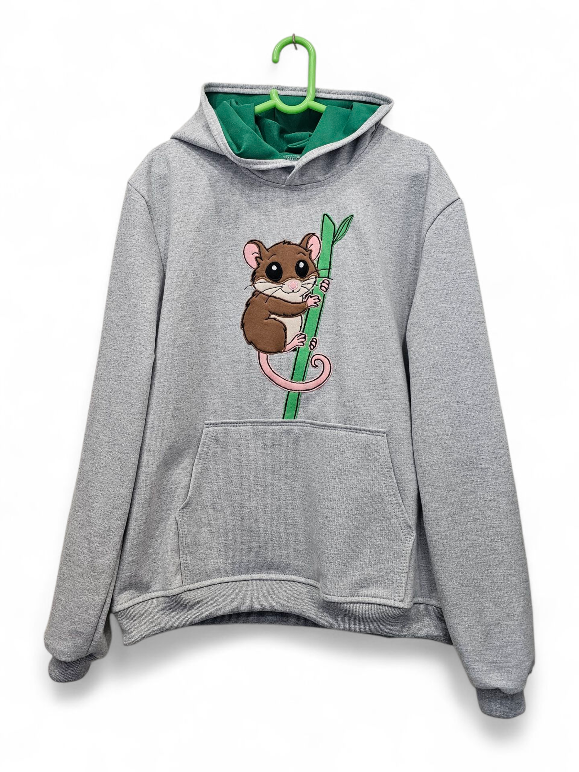 Materiales Utilizados: Diseño en técnica de tela forrada (appliqué) con franela en distintos tonos para lograr los detalles del animal y la quila. Polerón con Capucha y forro interior en color verde de contraste.
