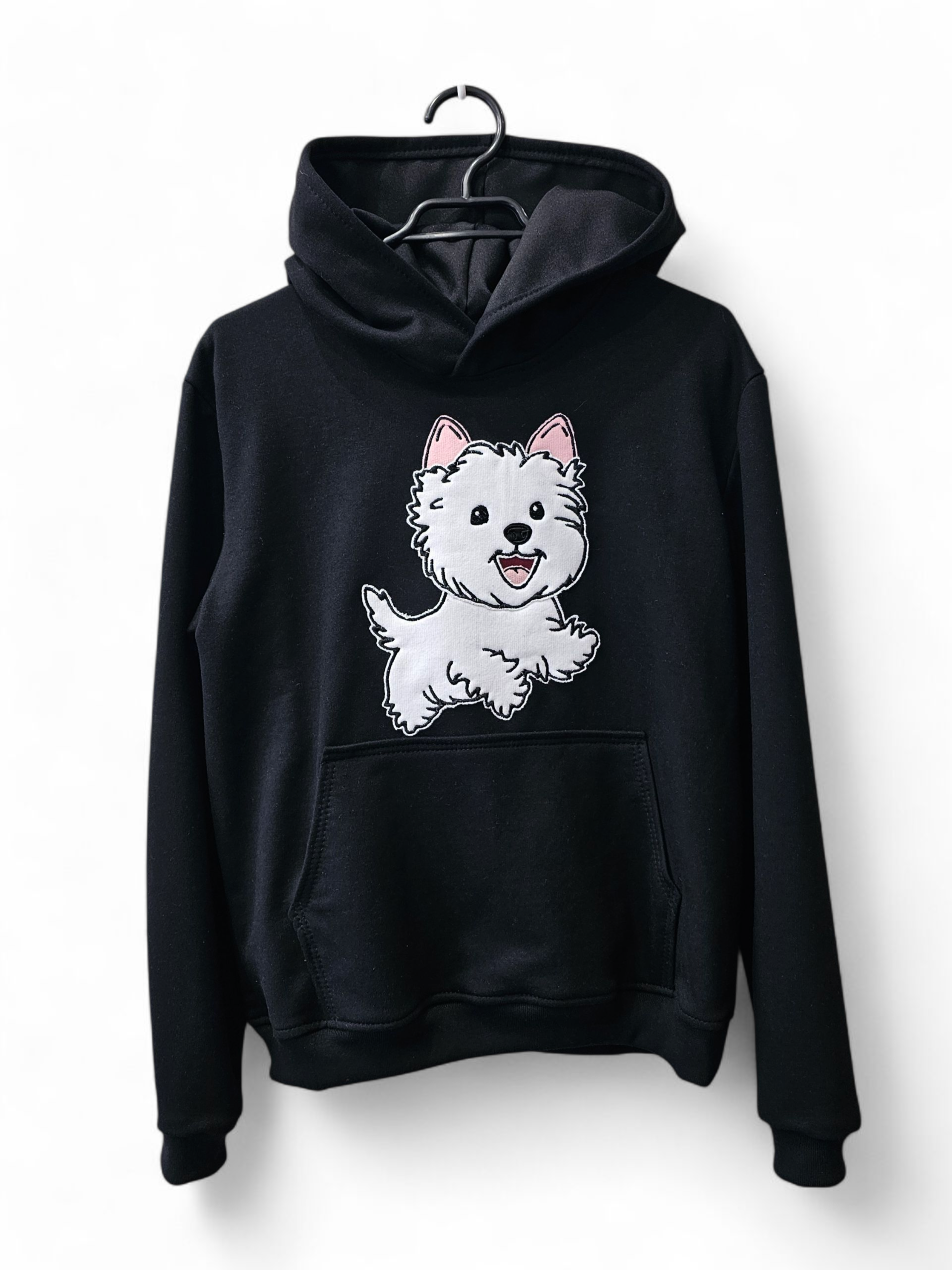 Este polerón captura la alegría de un perrito saltando y corriendo, muy parecido a los Westies, plasmada en una técnica de tela bordada sobre la franela. Incluye una gorra y un bolsillo canguro.