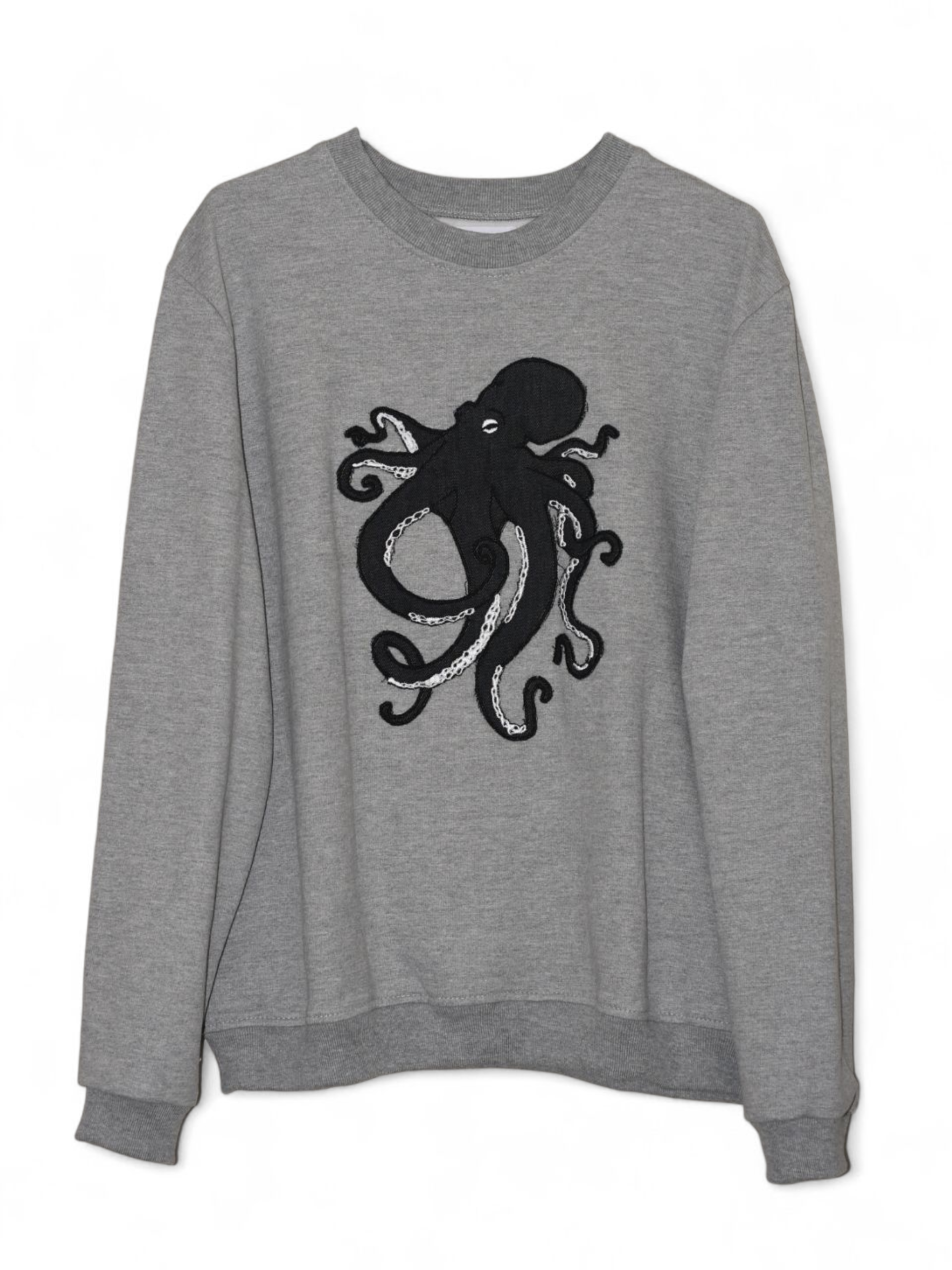 Materiales Utilizados: Diseño en técnica de tela forrada utilizando mezclilla reciclada para el pulpo. Polerón clásico de cuello redondo.