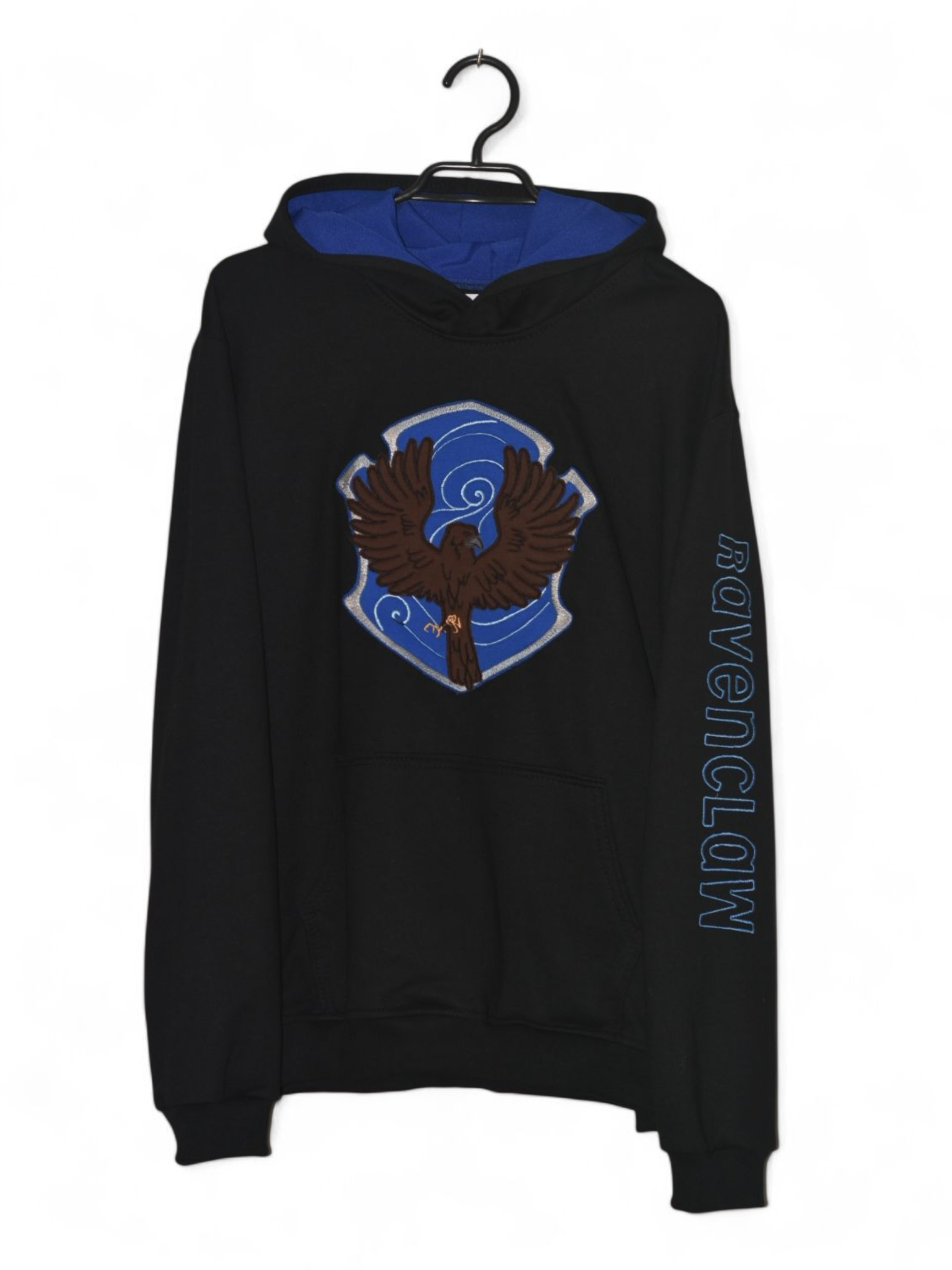 Materiales Utilizados: Logo oficial de Ravenclaw en el pecho. Detalle de diseño en el brazo izquierdo. Gorra con forro interior en color azul (o bronce/cobre, según el emblema que uses). Polerón con Bolsillo Canguro reforzado.