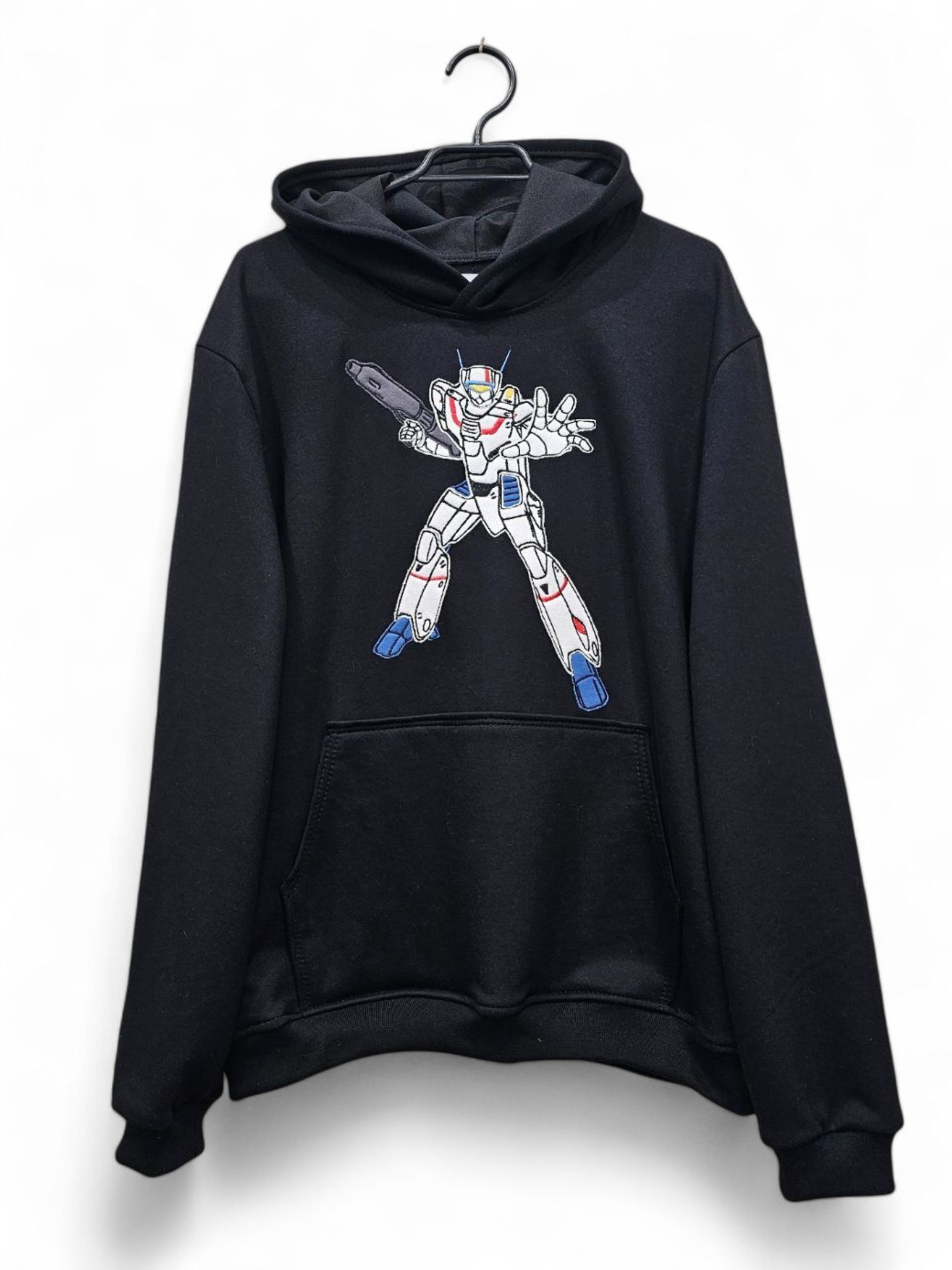 Un tributo a la icónica serie Robotech, con la figura del mecha mirando directamente al frente. Un diseño que evoca la ciencia ficción y la nostalgia de los 80, en un polerón de color negro que resalta su impacto.